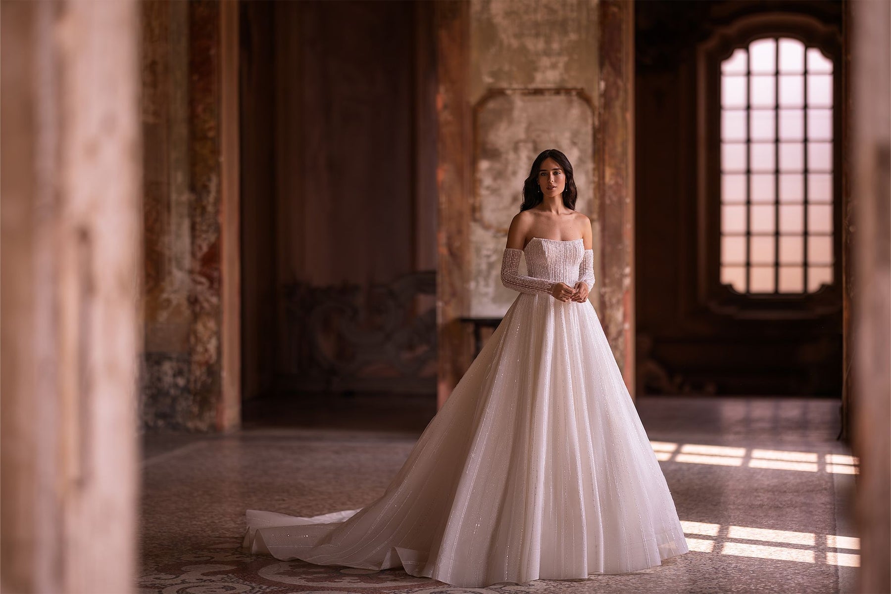 This elegant MARIA ANETTE 5519 dress features an off-shoulder neckline and an open back. The long silhouette is perfect for brides looking for a romantic and sophisticated look. Exude confidence and style on your special day with this stunning bride dress.
