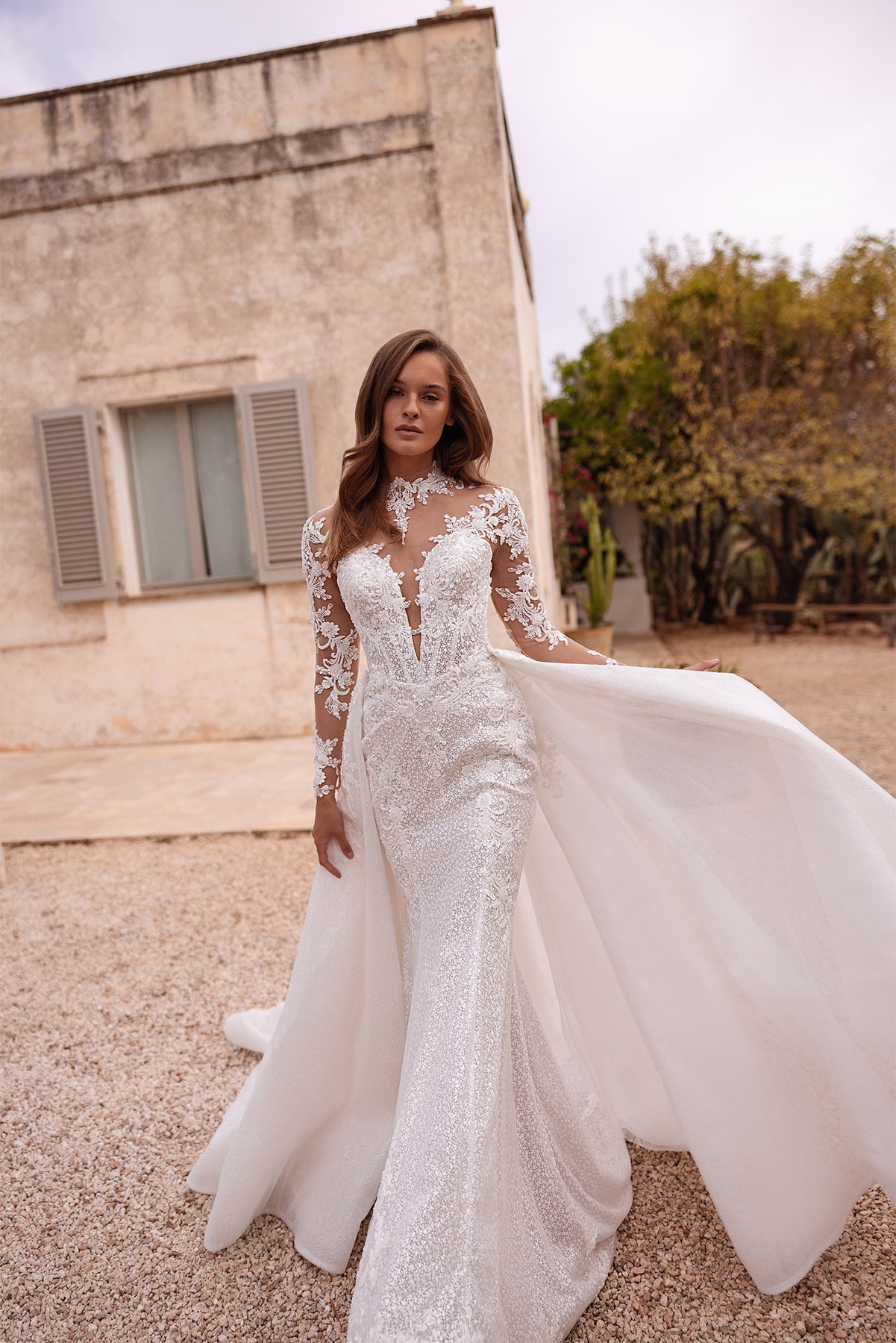 Behold the Maria Anette 5805—timeless elegance with a modern edge. This exquisite bridal gown features a sophisticated high neckline that exudes grace and refinement, paired with a flowing extension that adds movement and drama. The long silhouette creates a stunning vertical line that's both flattering and utterly romantic. Perfect for the bride who appreciates classic beauty with contemporary style, this dress promises to make you feel poised, radiant, and absolutely unforgettable on your special day.