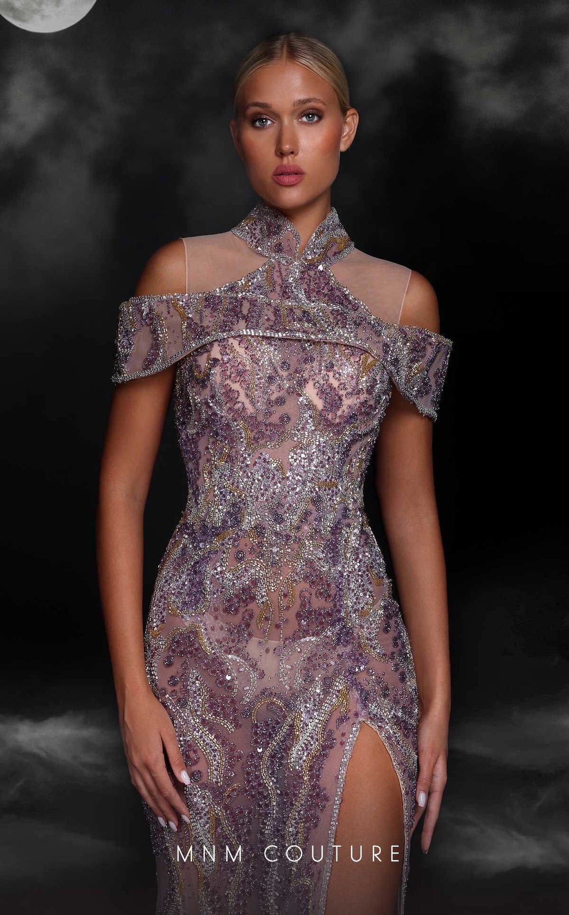 MNM Couture K4103 combines modern features like cold shoulders and a high slit with a classic sheath silhouette. The illusion yoke and see-through beaded bodice add allure, while the sweep train makes this gown perfect for red-carpet looks.