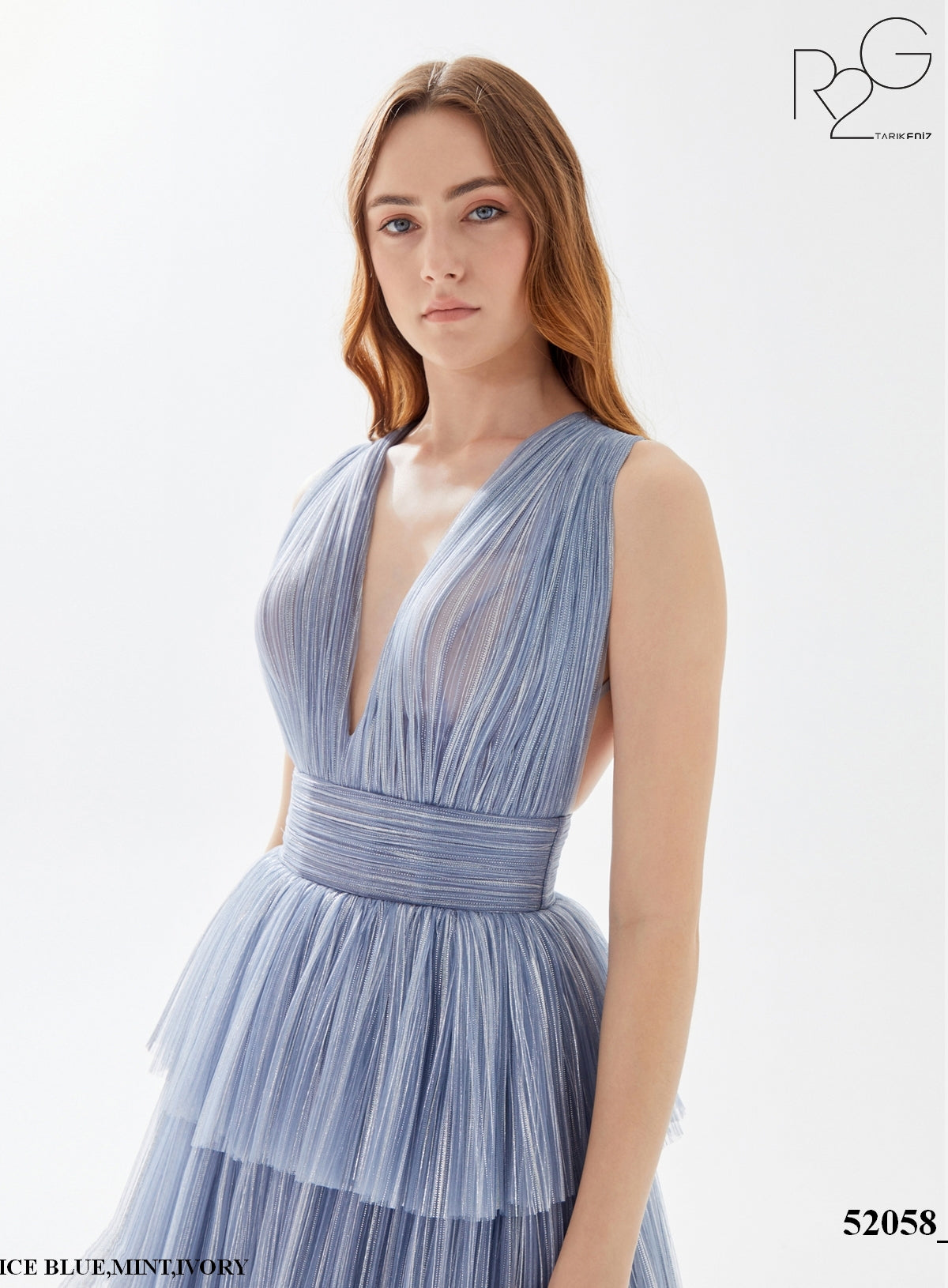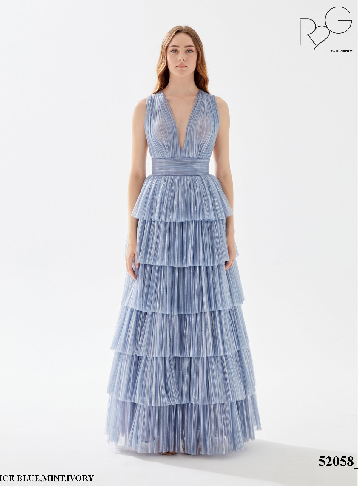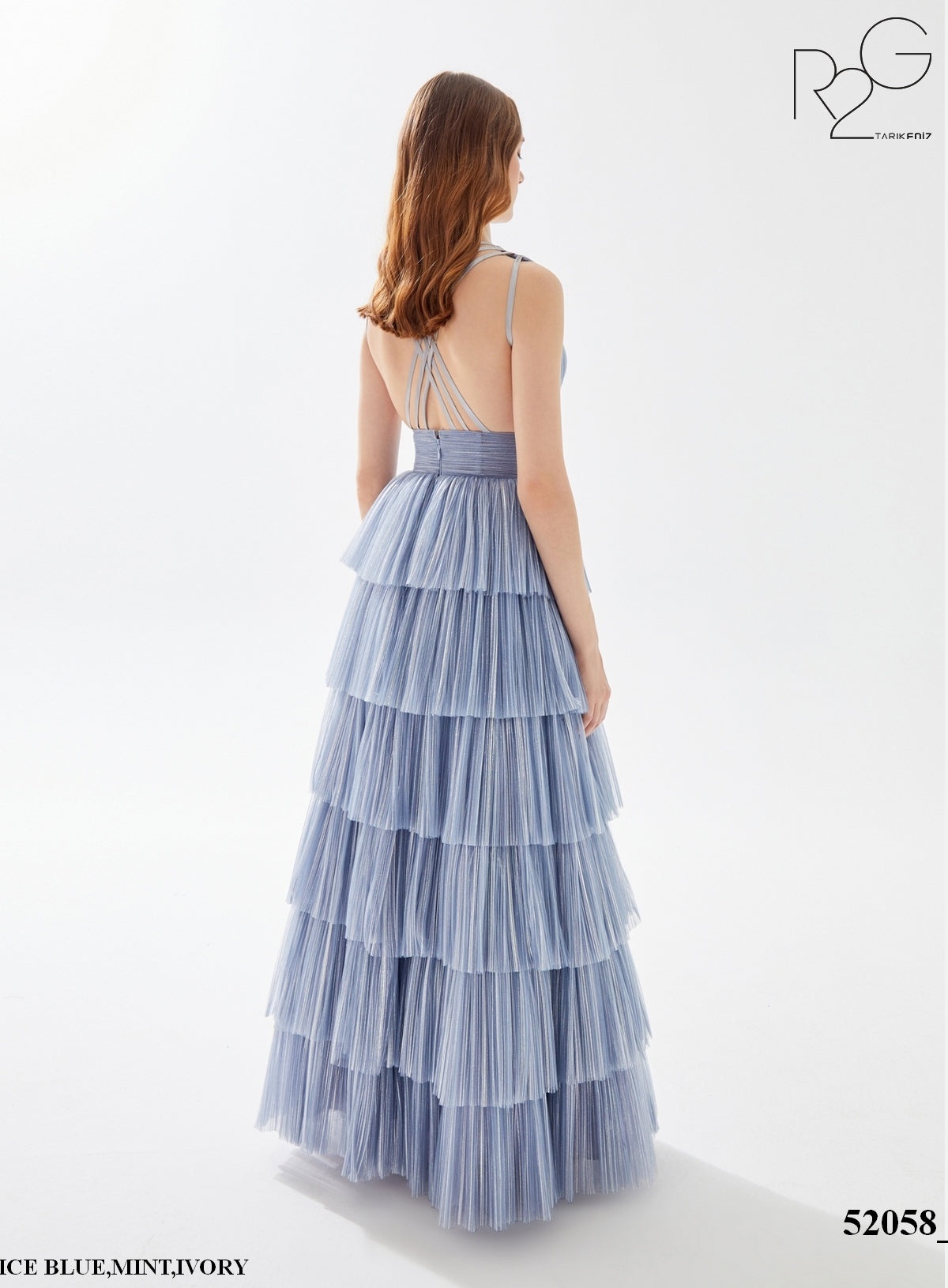 Expertly crafted by TARIK EDIZ, the 52058 Dress is both elegant and modern. Its fitted design and V neckline flatter the figure, while the open back with x straps adds a touch of sultry sophistication. The cascading ruffles skirt creates a dramatic and glamorous statement, making it the perfect choice for prom or evening events.