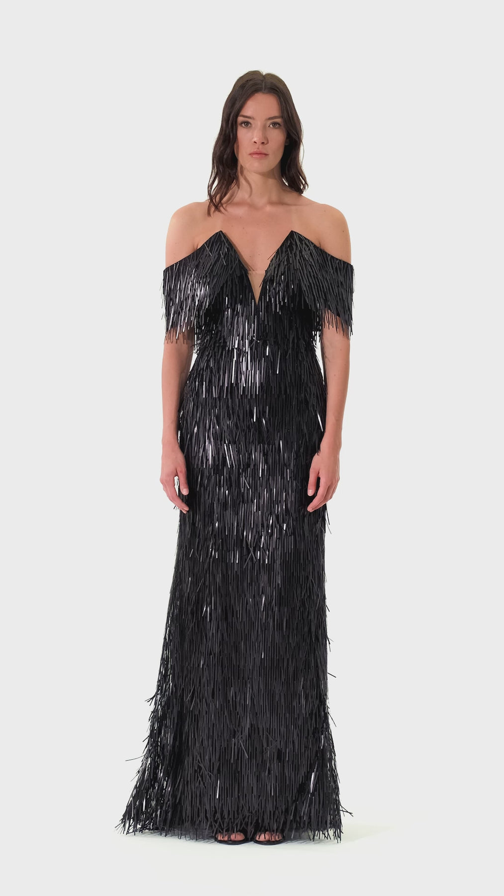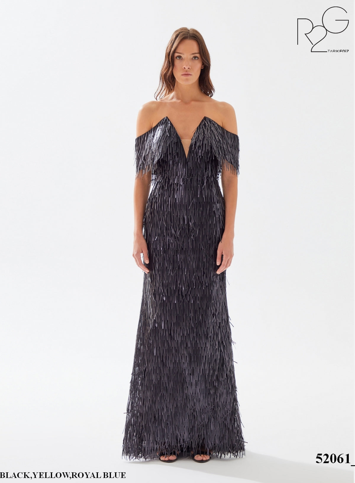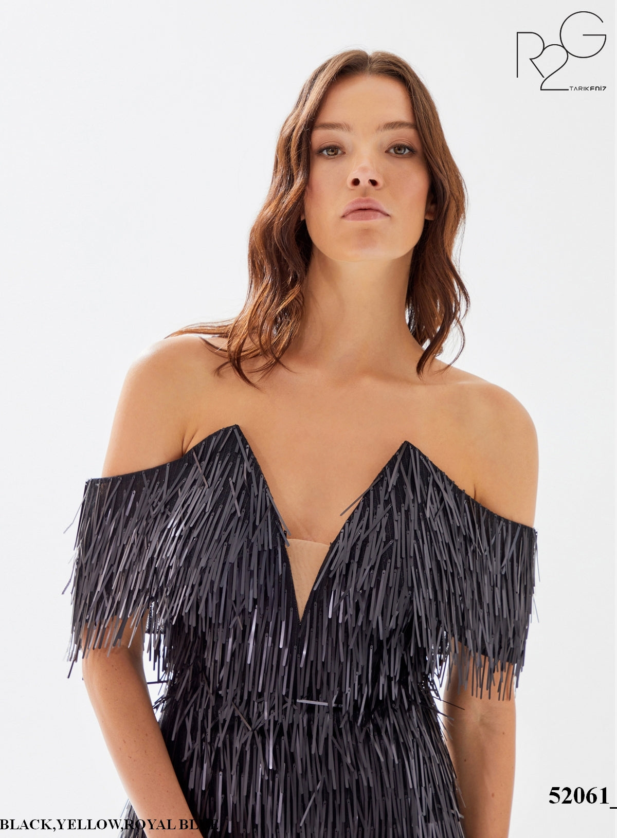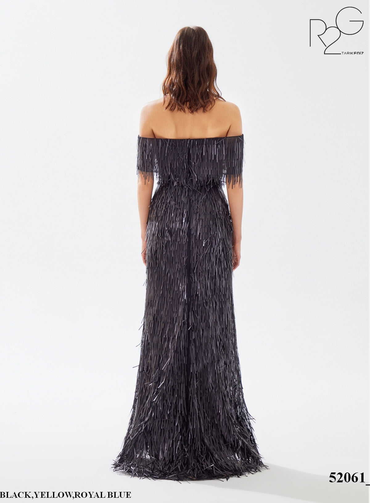Achieve the ultimate couture look with TARIK EDIZ 52061 Dress. Featuring a v neckline, straight across backline, and off-shoulder design, this floor-length dress is adorned with elegant fringed embellishments. Perfect for prom or evening events, make a statement with this show-stopping dress.