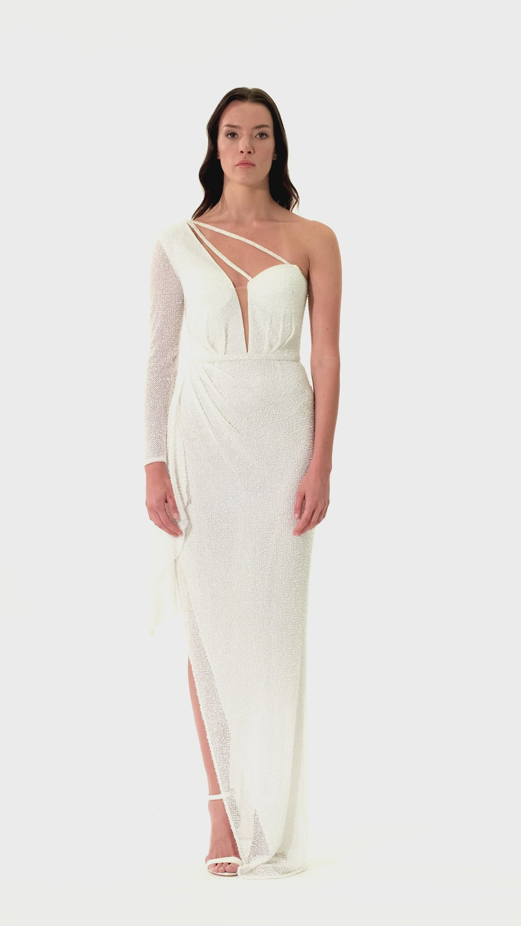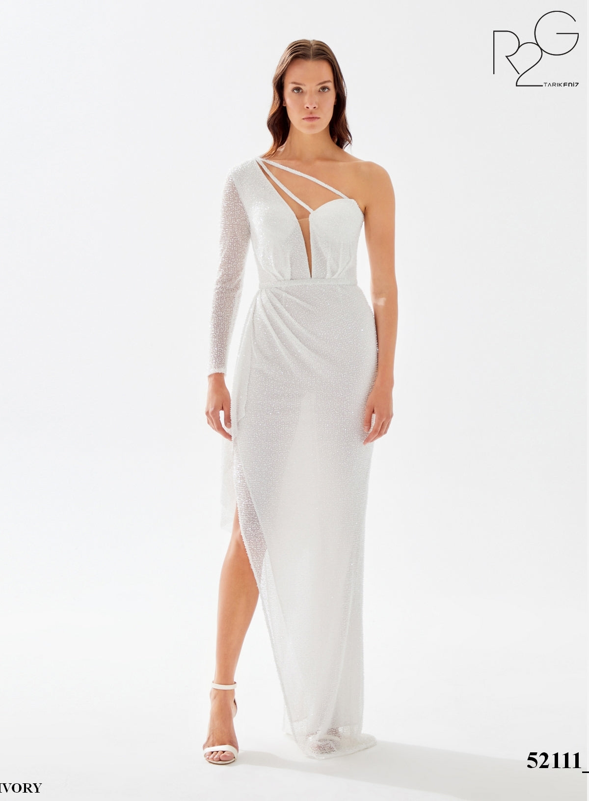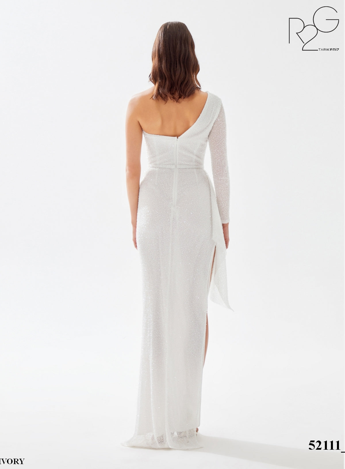 Introducing the TARIK EDIZ 52111 Dress, a stunning and elegant floor-length dress perfect for any prom or evening event. With a deep v neckline and one shoulder (long sleeve) straps, this dress is both alluring and stylish. The embellishments and sheer fabric add a touch of glamour, while the long slit adds a modern twist. Feel confident and beautiful in this must-have dress.