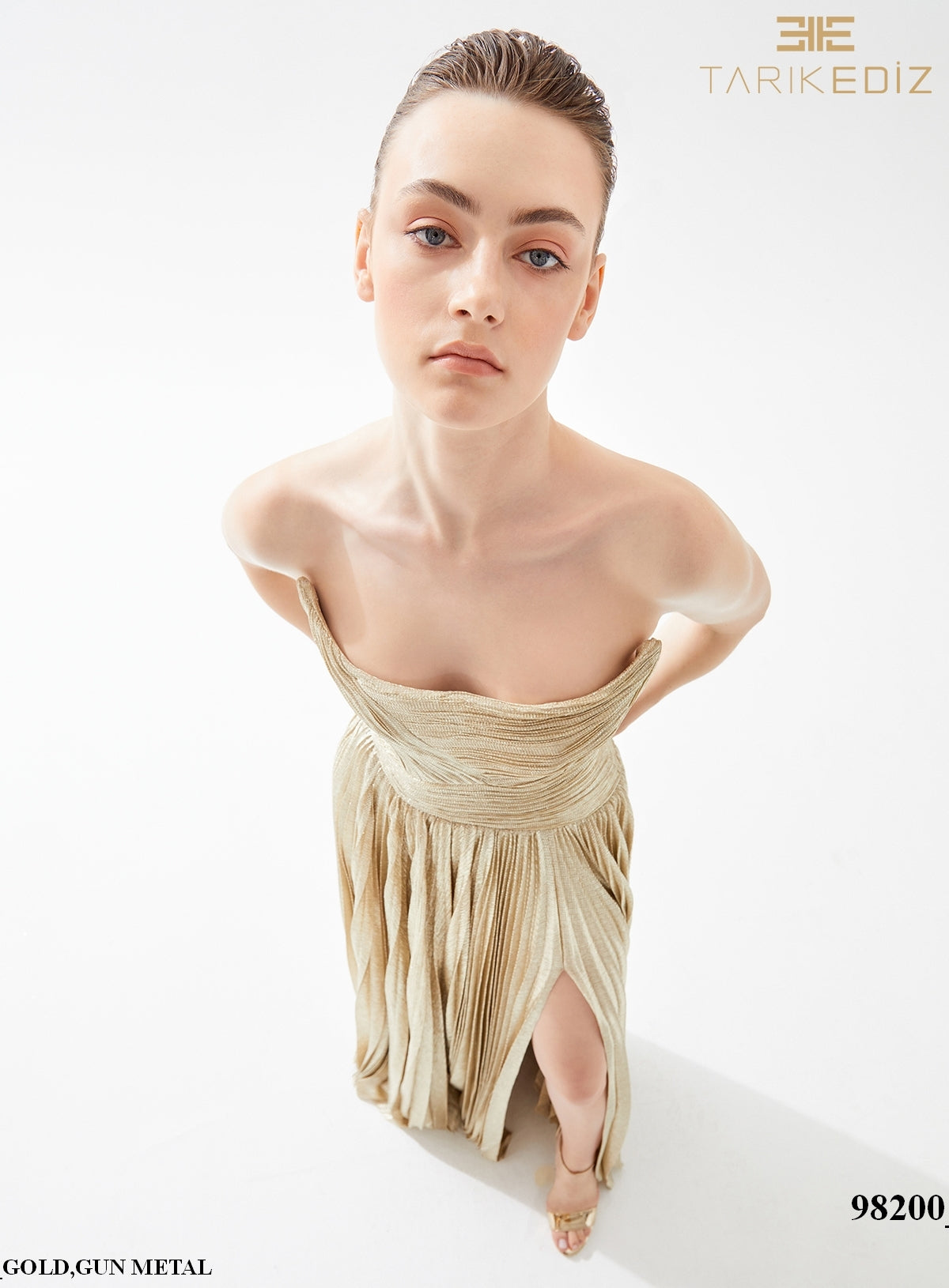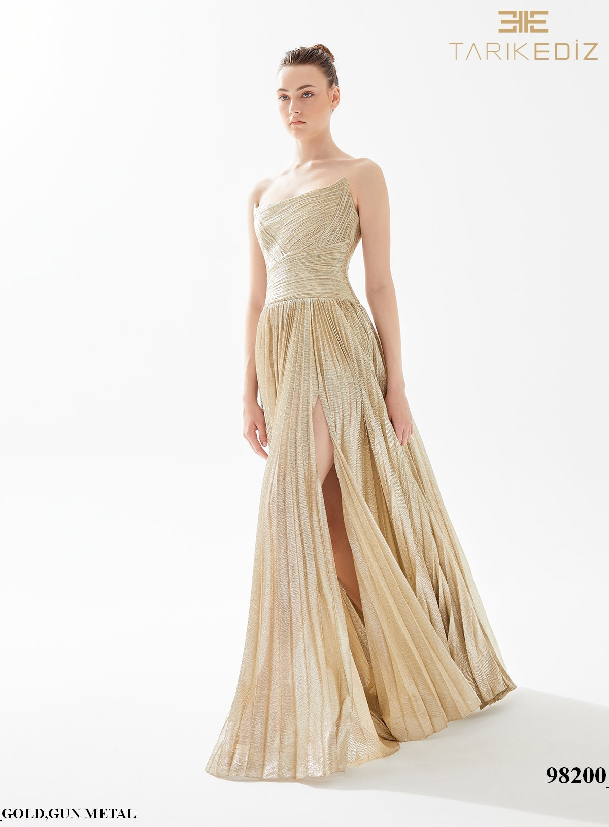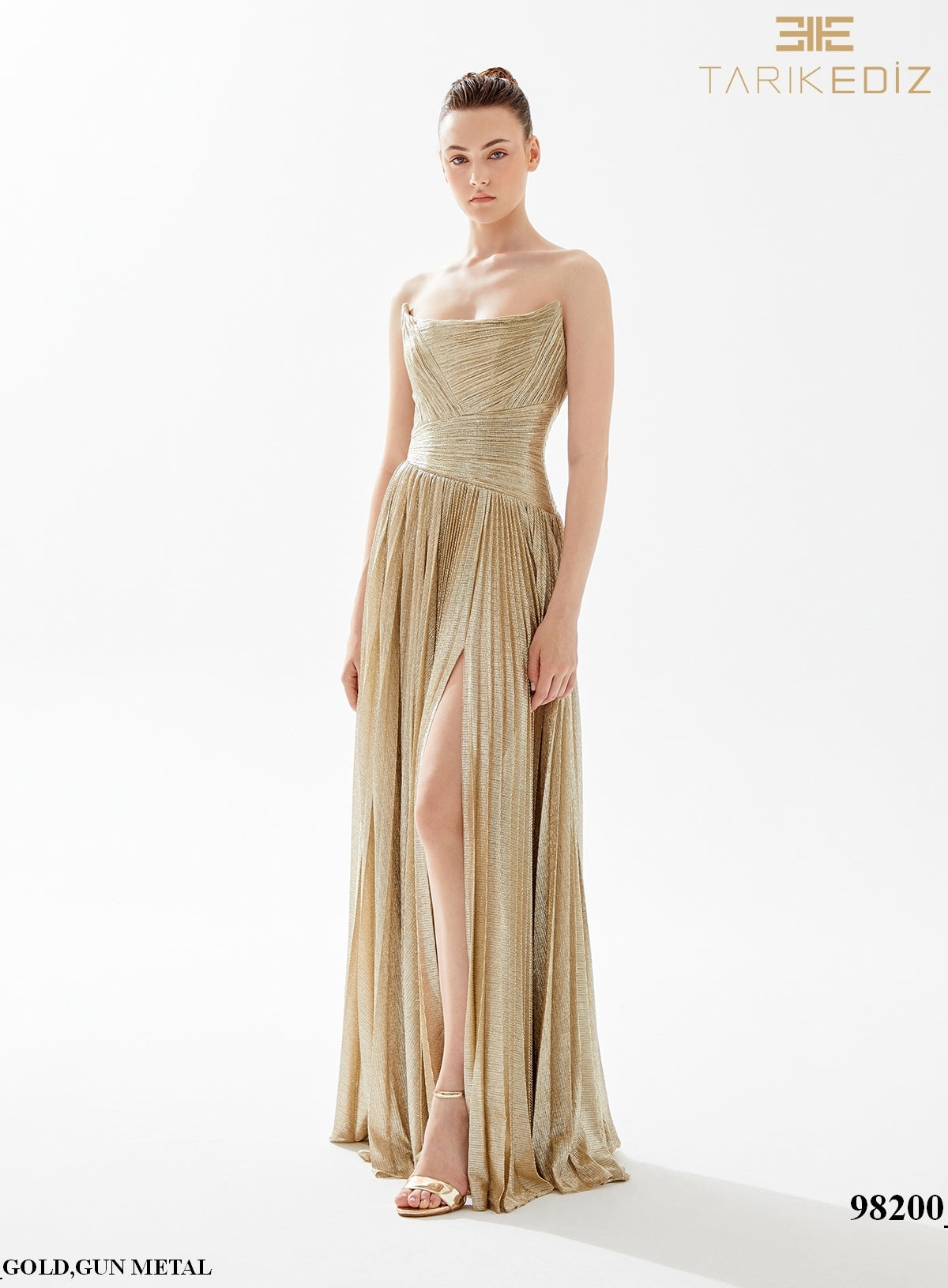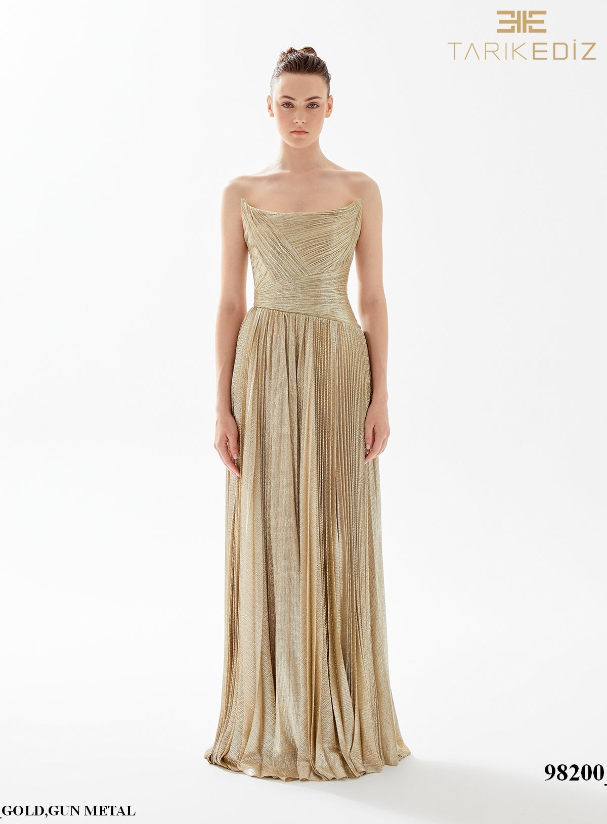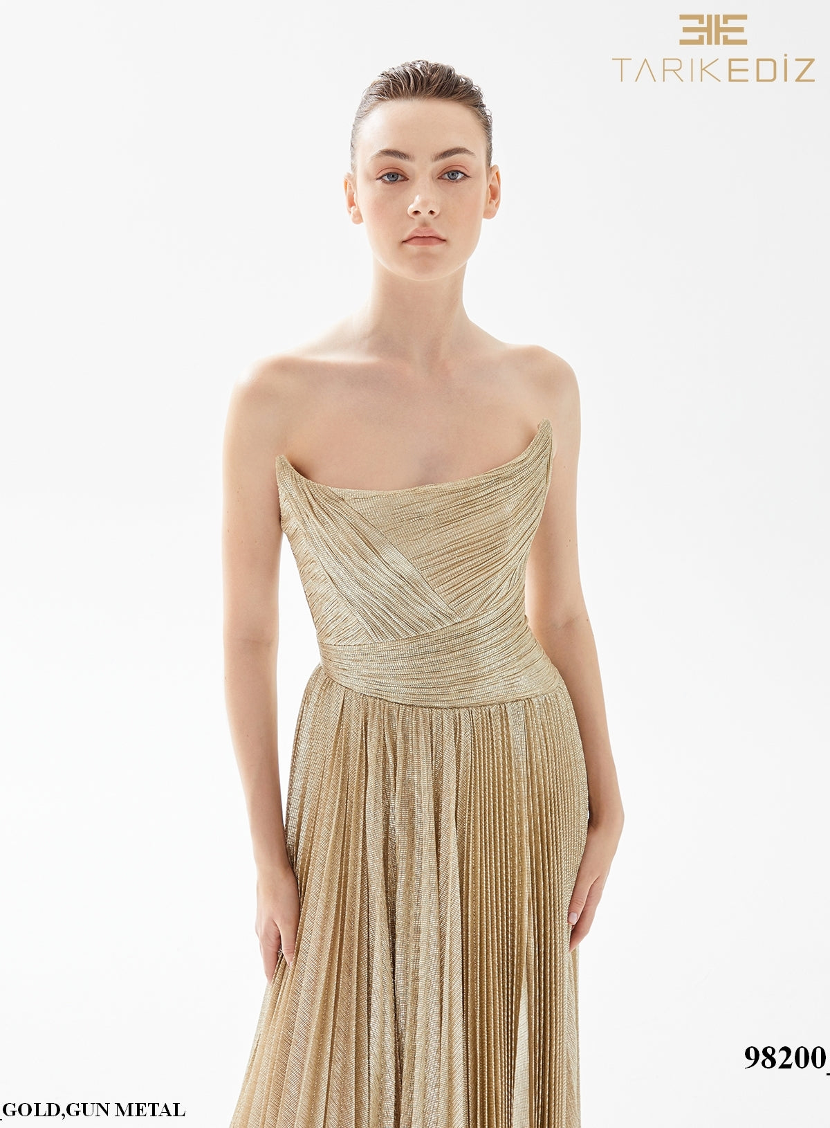 Don't be shy to embrace your femineity in this Tarik Ediz 98200 gown. This strapless dress features a draped look and pleats. All eyes are guaranteed to be on you.