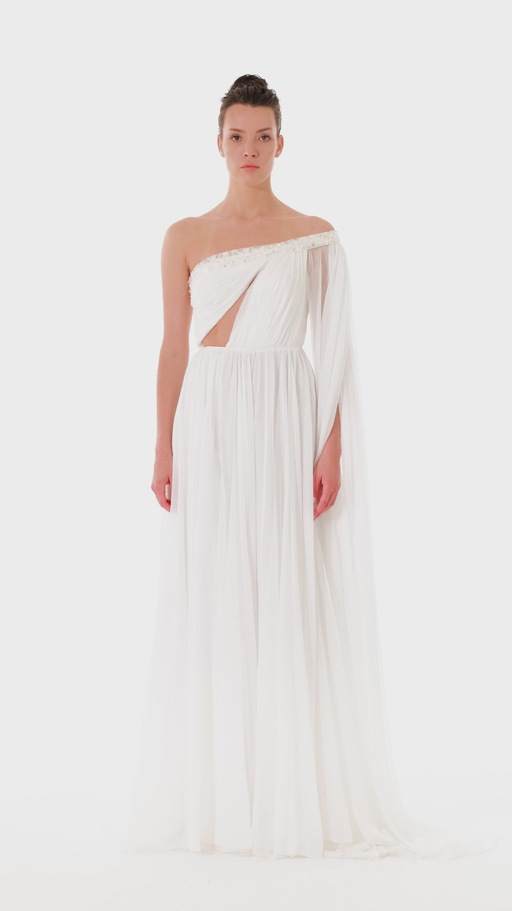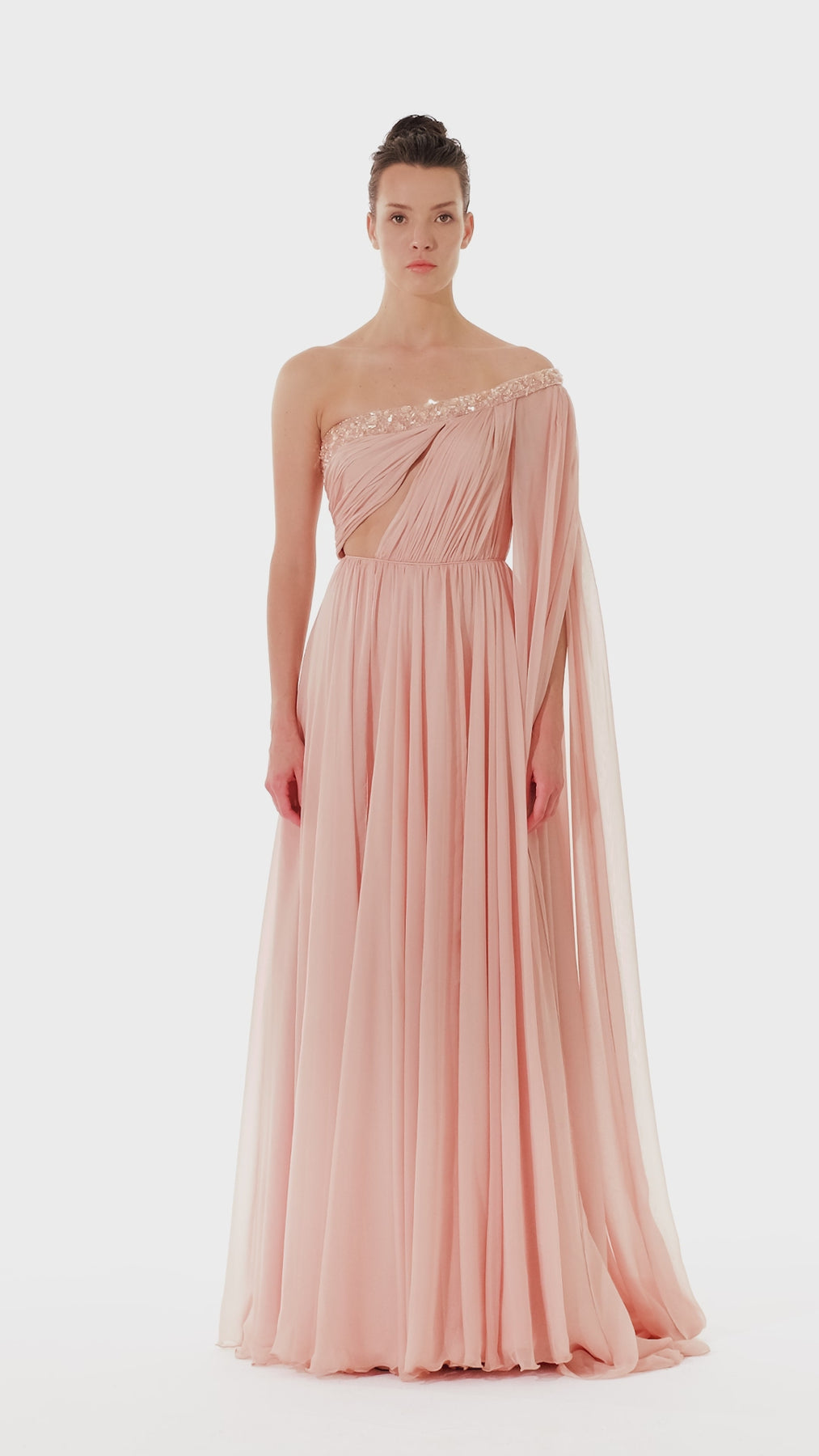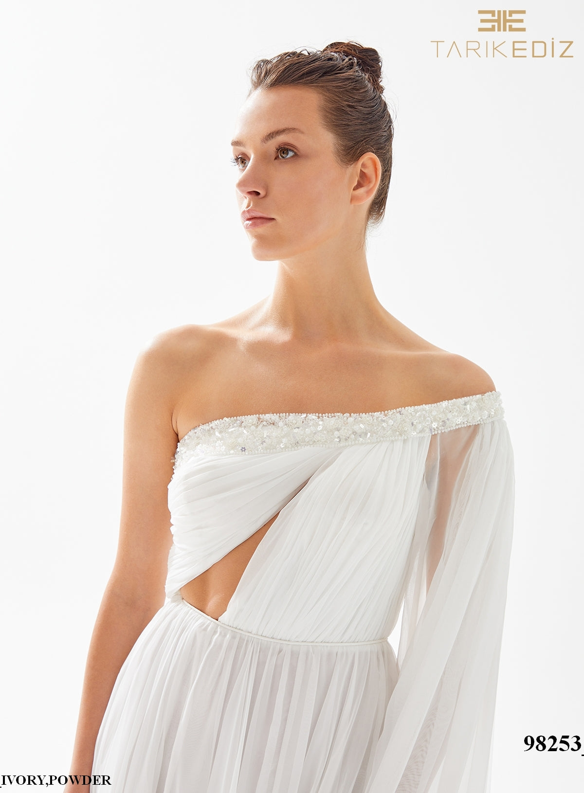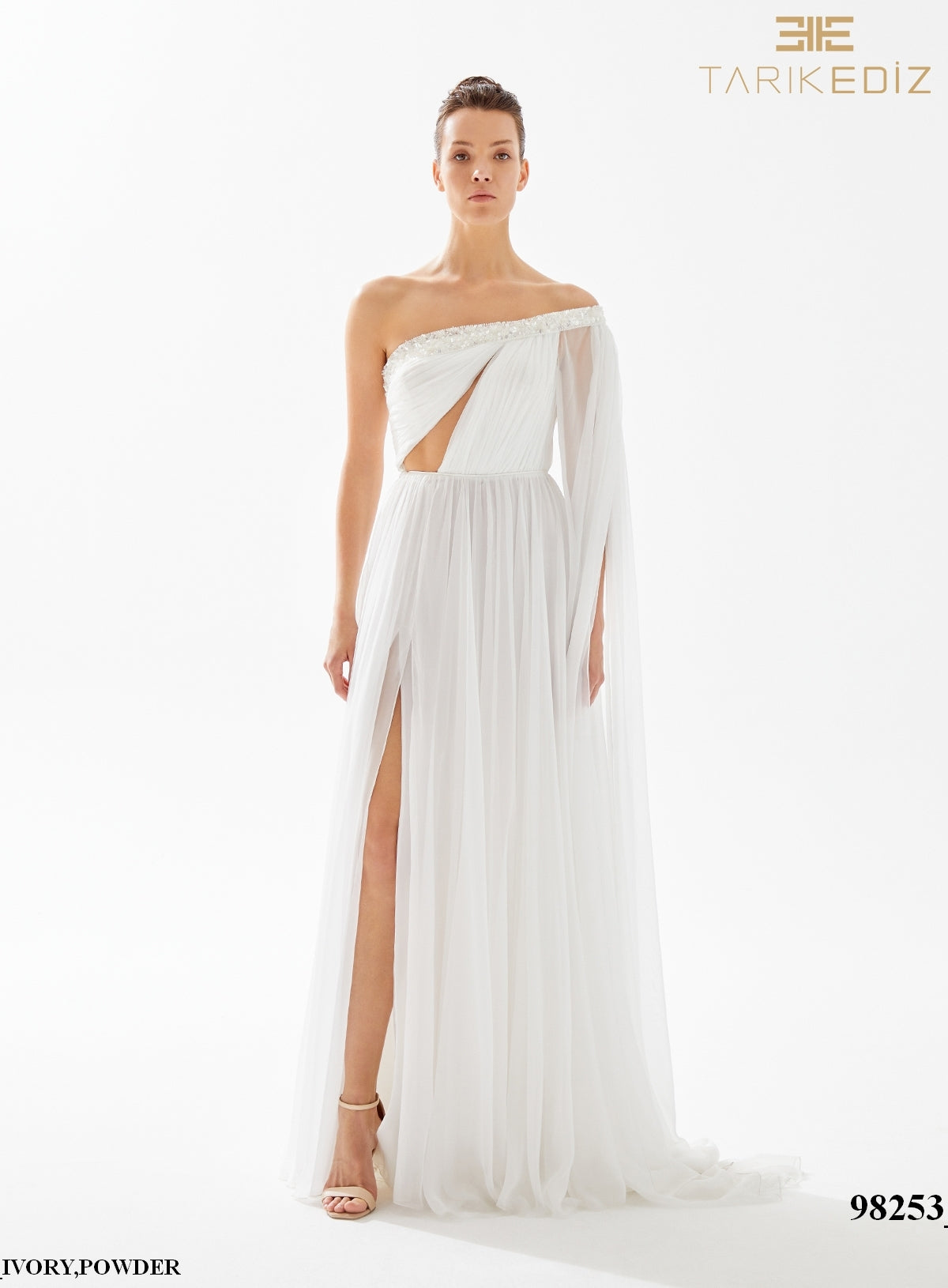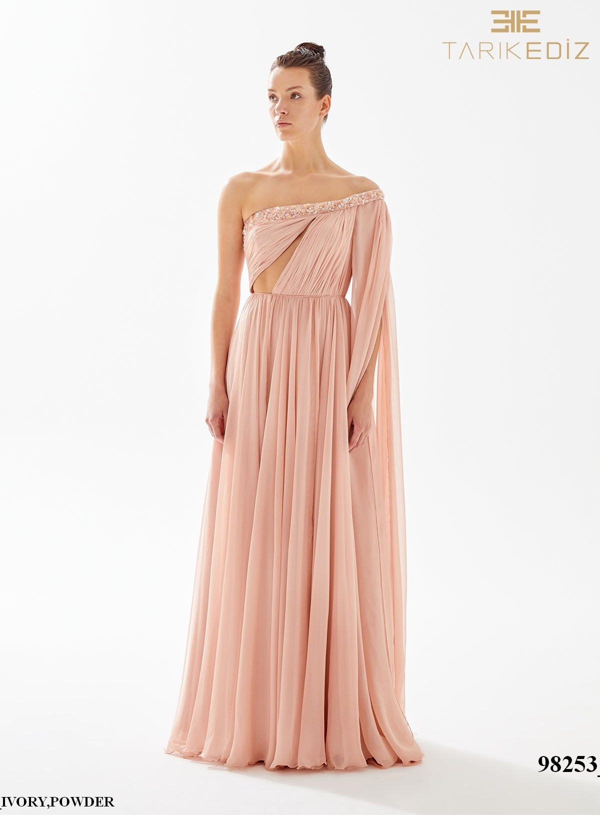 Feel like royalty in this gown by Tarik Ediz style 98253. This asymmetric gown features a single off shoulder sleeve and pleats. The neckline is adorned with rhinestone lace and the cut-out detail on the top is guaranteed to make you feel your best. This dress is perfect for any occasion!