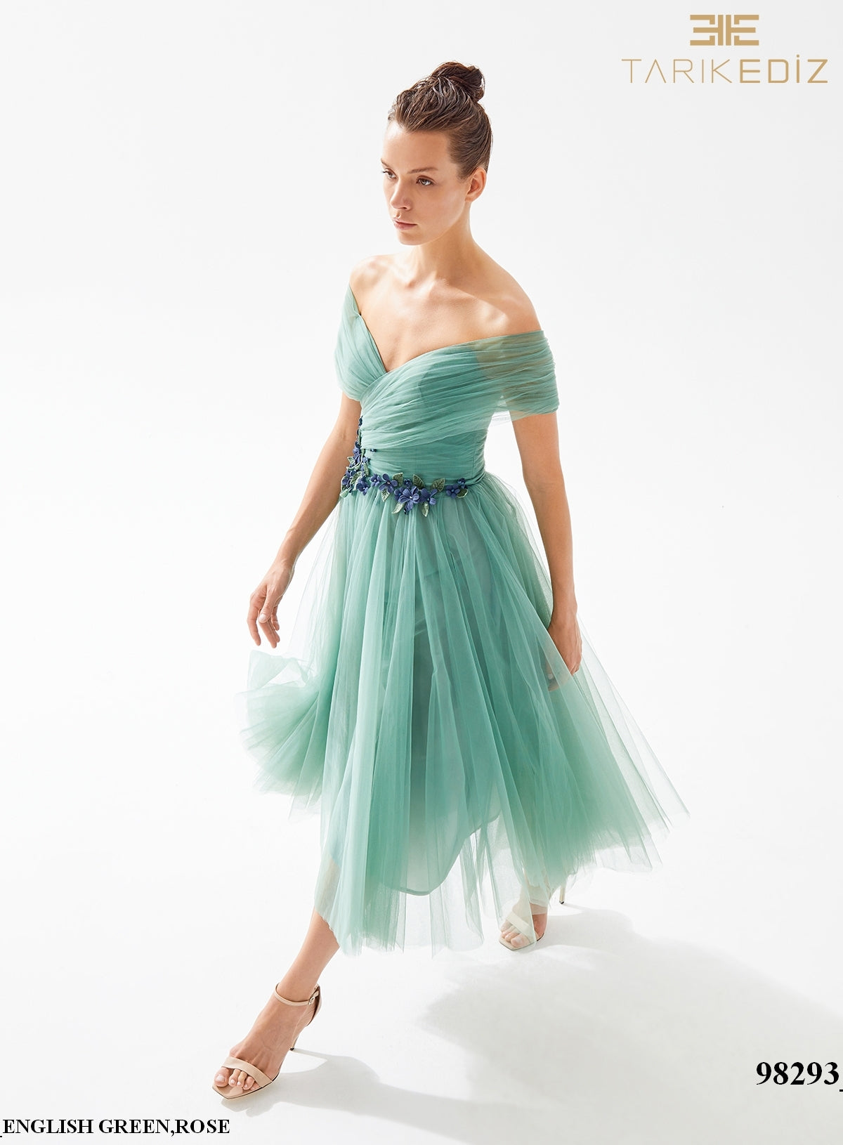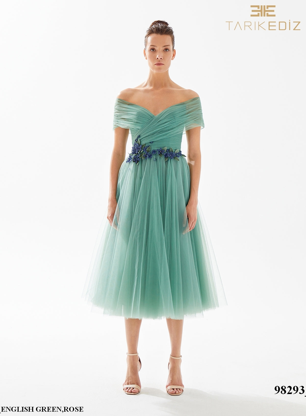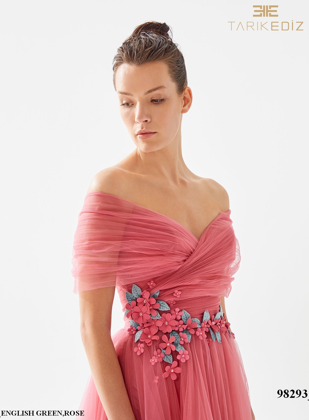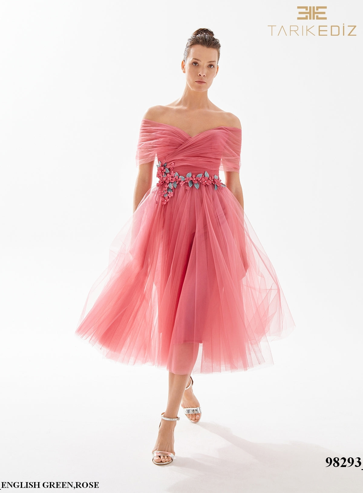Feel classy in this Tarik Ediz 98293 dress. This midi dress has tulle and floral appliques that will make you feel expensive. The off-the-shoulder neckline allows you to match the perfect necklace/earrings to complete the look.