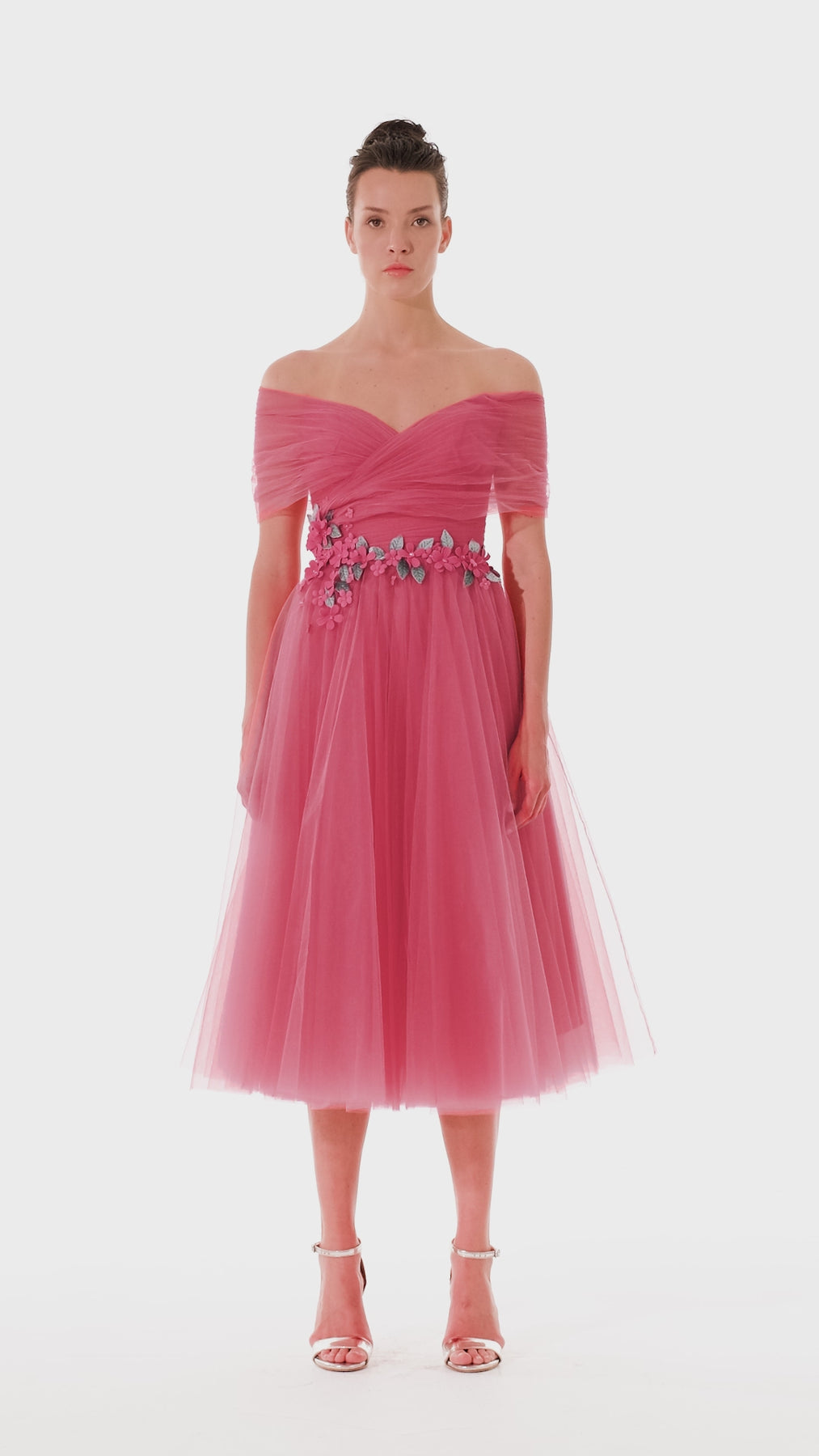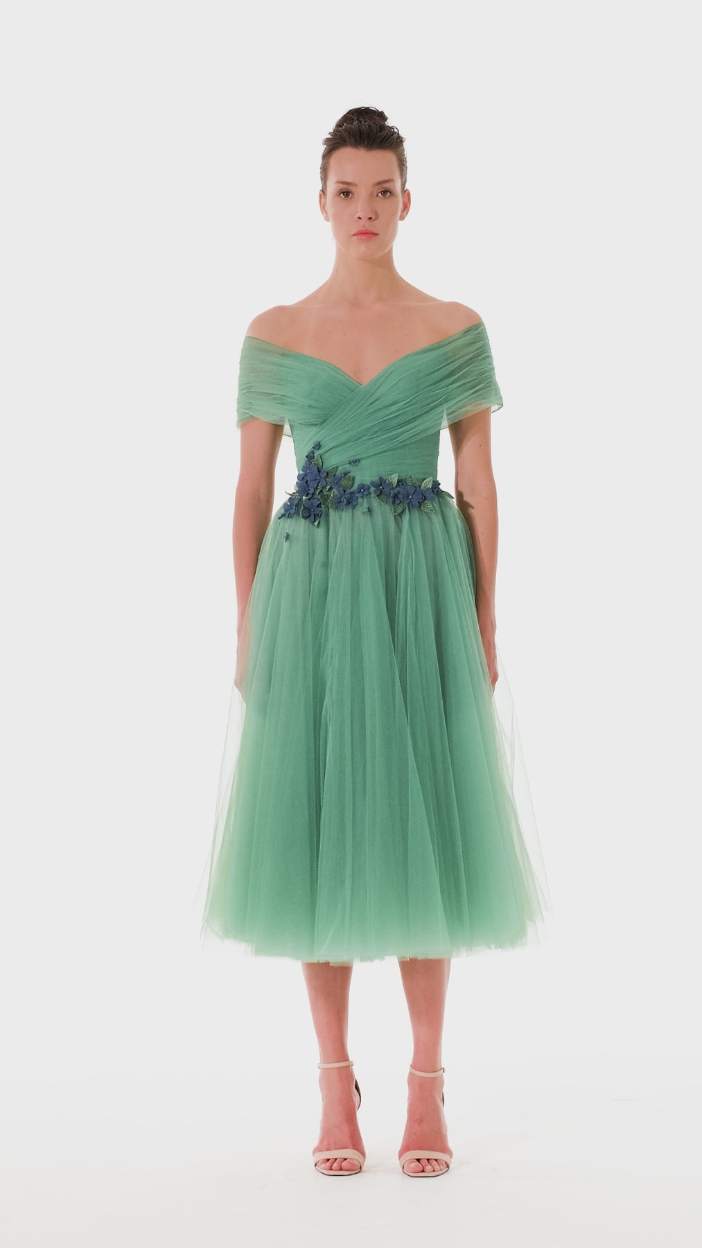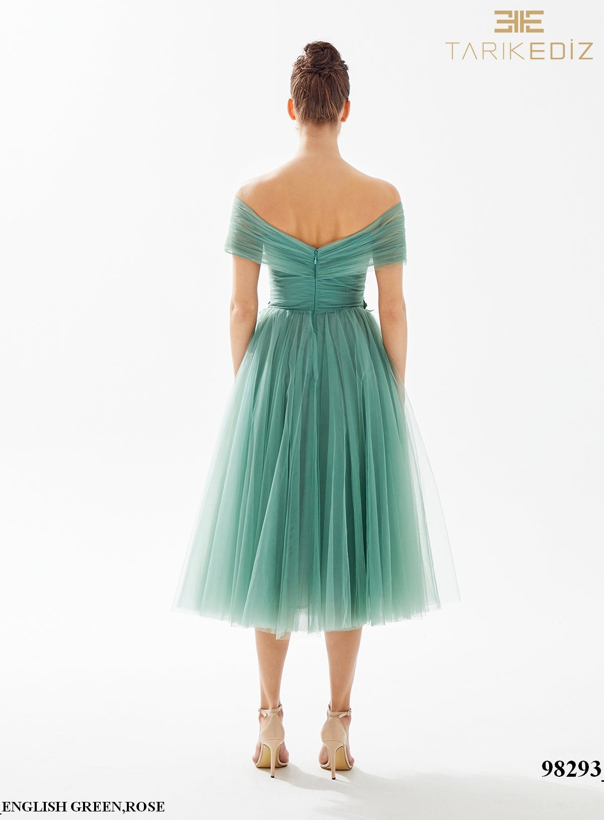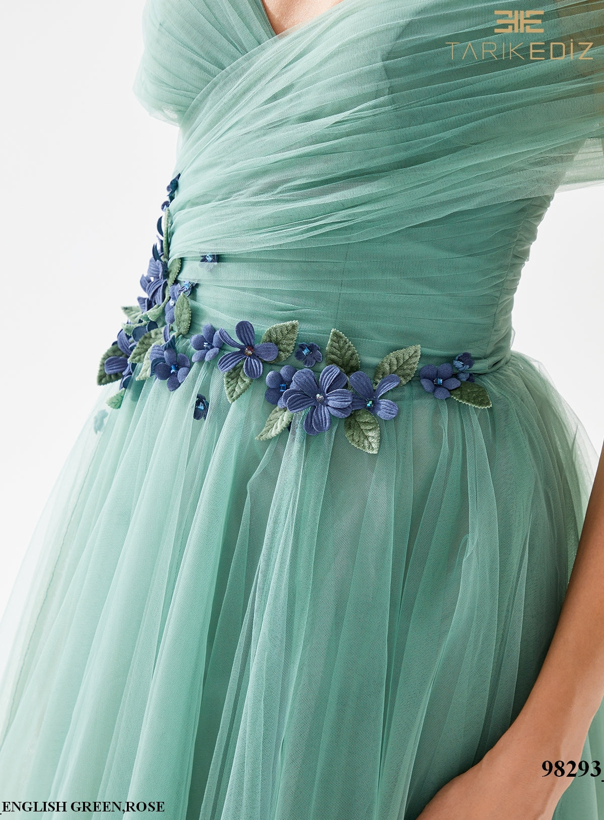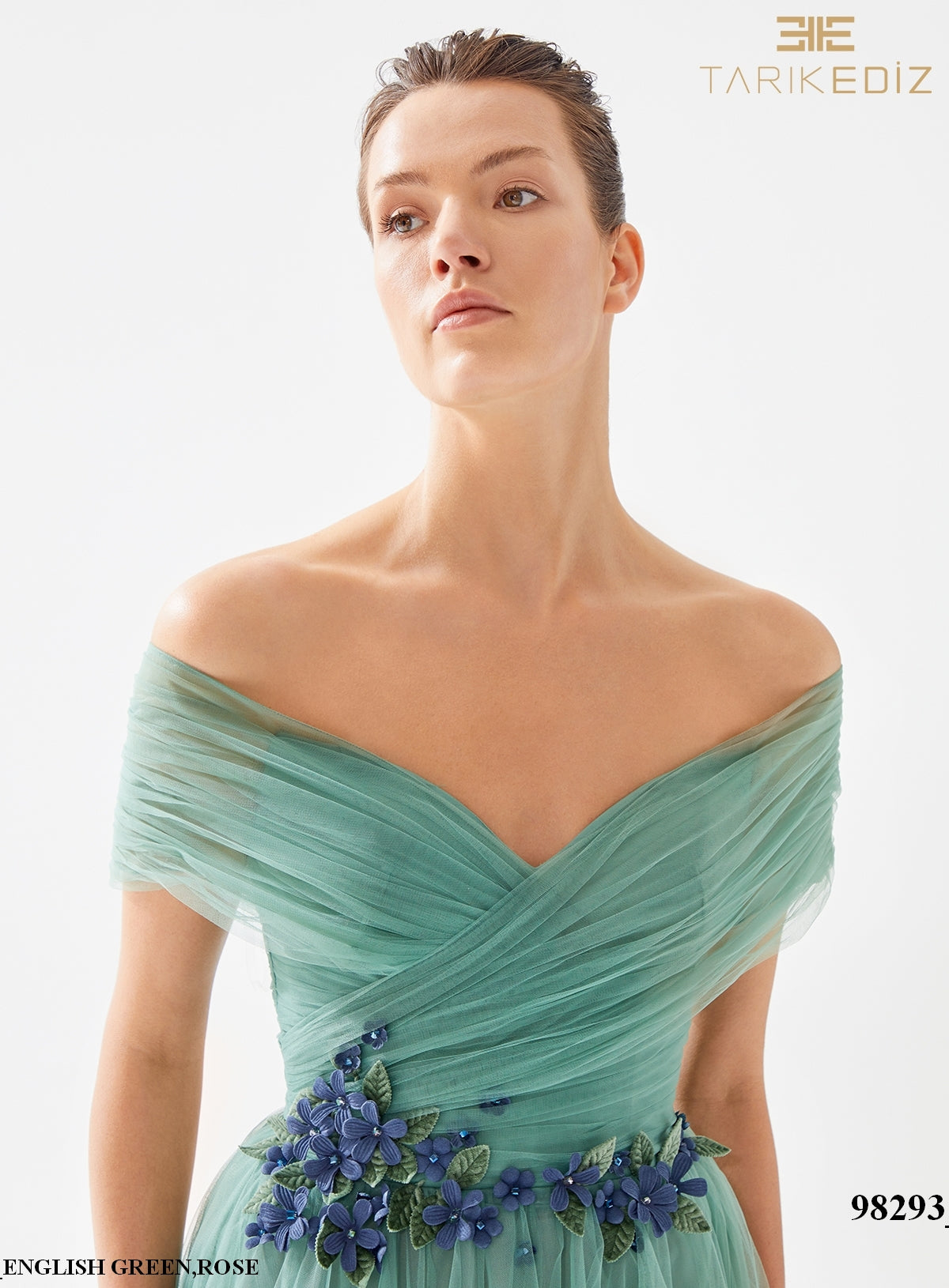 Feel classy in this Tarik Ediz 98293 dress. This midi dress has tulle and floral appliques that will make you feel expensive. The off-the-shoulder neckline allows you to match the perfect necklace/earrings to complete the look.