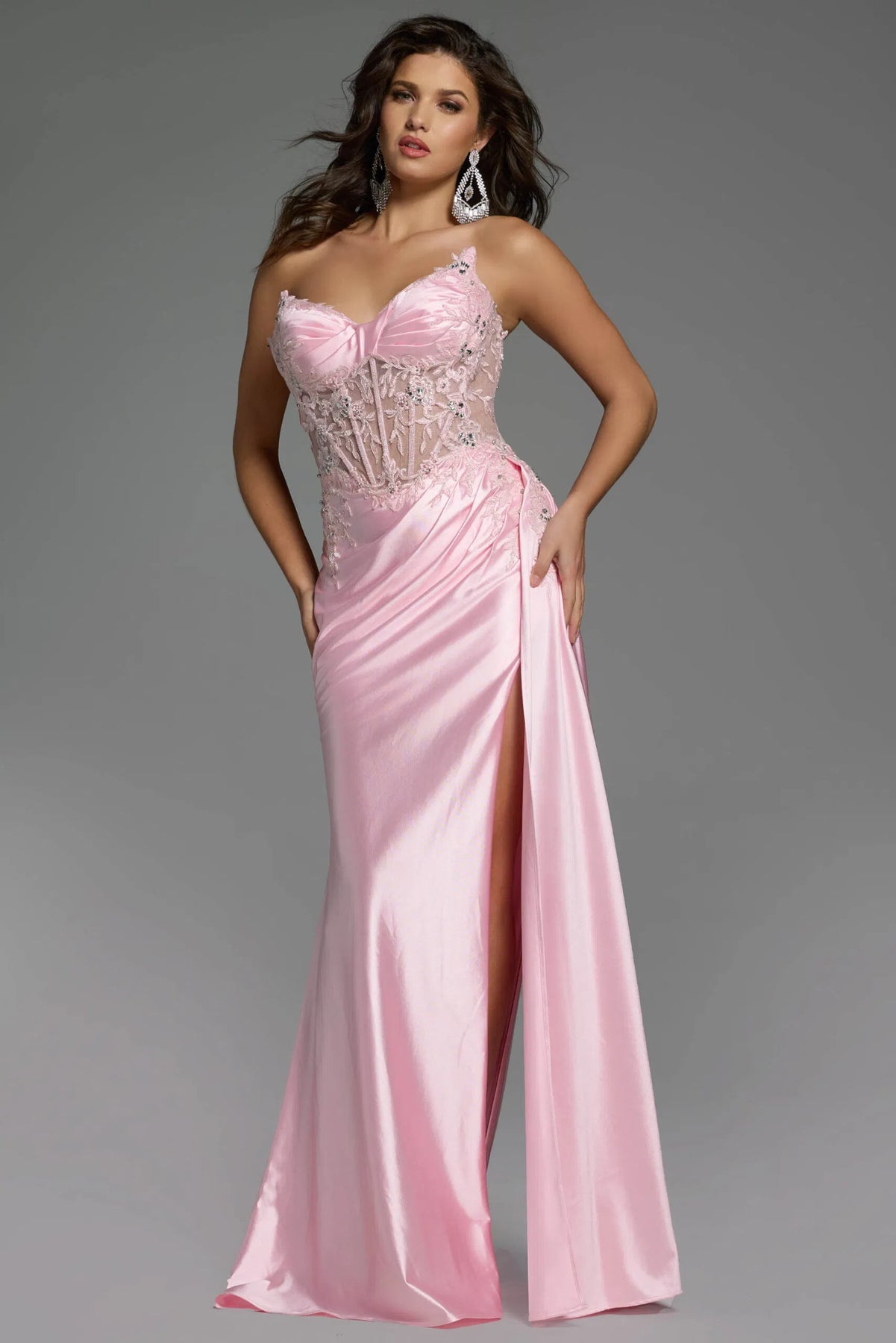 Get ready to make a statement at prom with the Jovani 43848 dress. Its romantic sweetheart neckline and intricate lace bodice will leave you feeling confident and beautiful. The ruched satin fabric cinches the waist, while a daring high leg slit adds allure. With its low back and floor-length design, this gown offers a timeless and luxurious look for any formal event. Step into elegance with Jovani.