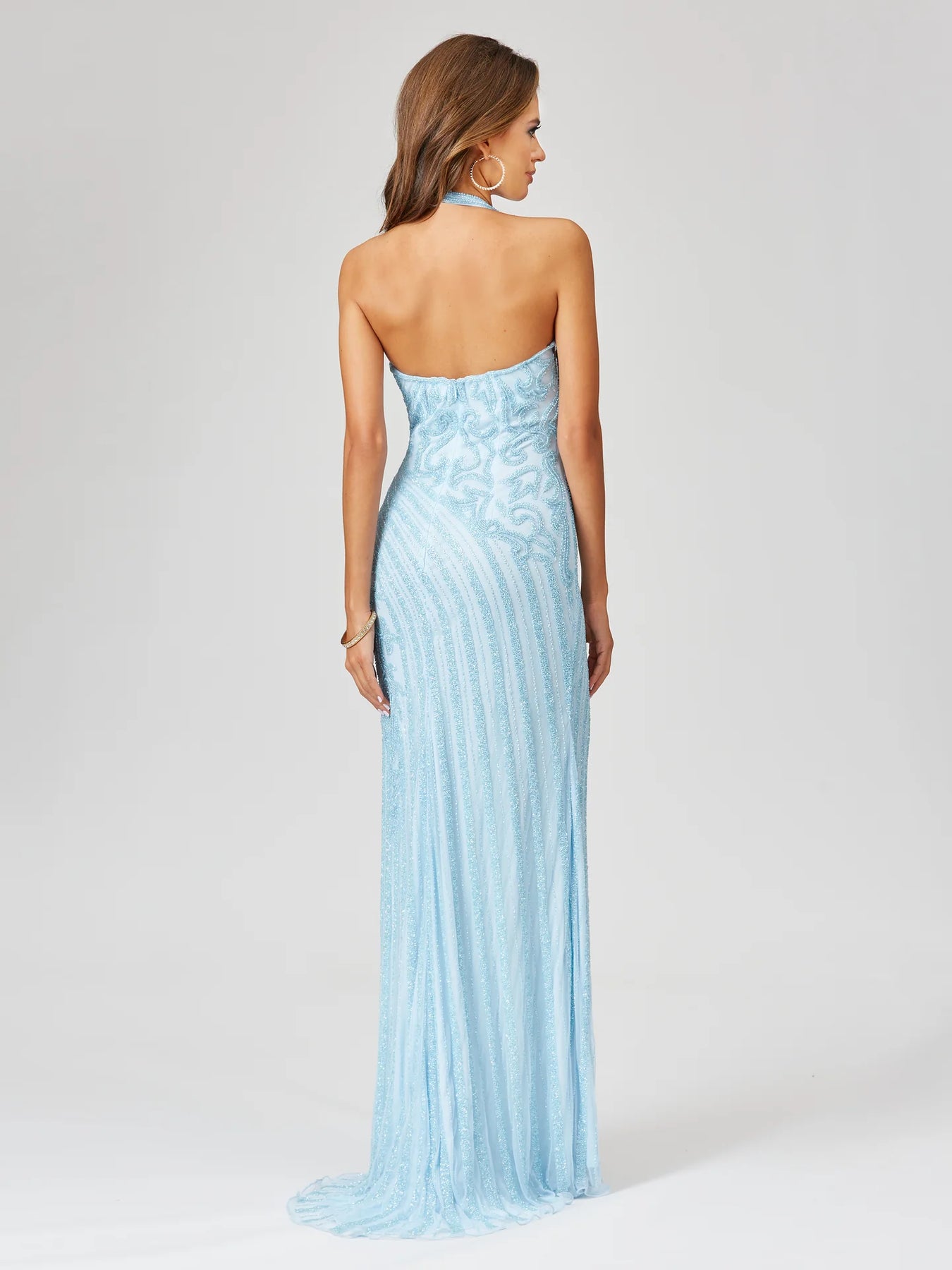 Dazzle in this gorgeous beaded gown with a head turning slit. The fabric is stretchy and comfortable so you'll look great and feel it too! Perfect for prom season or any formal Spring event!