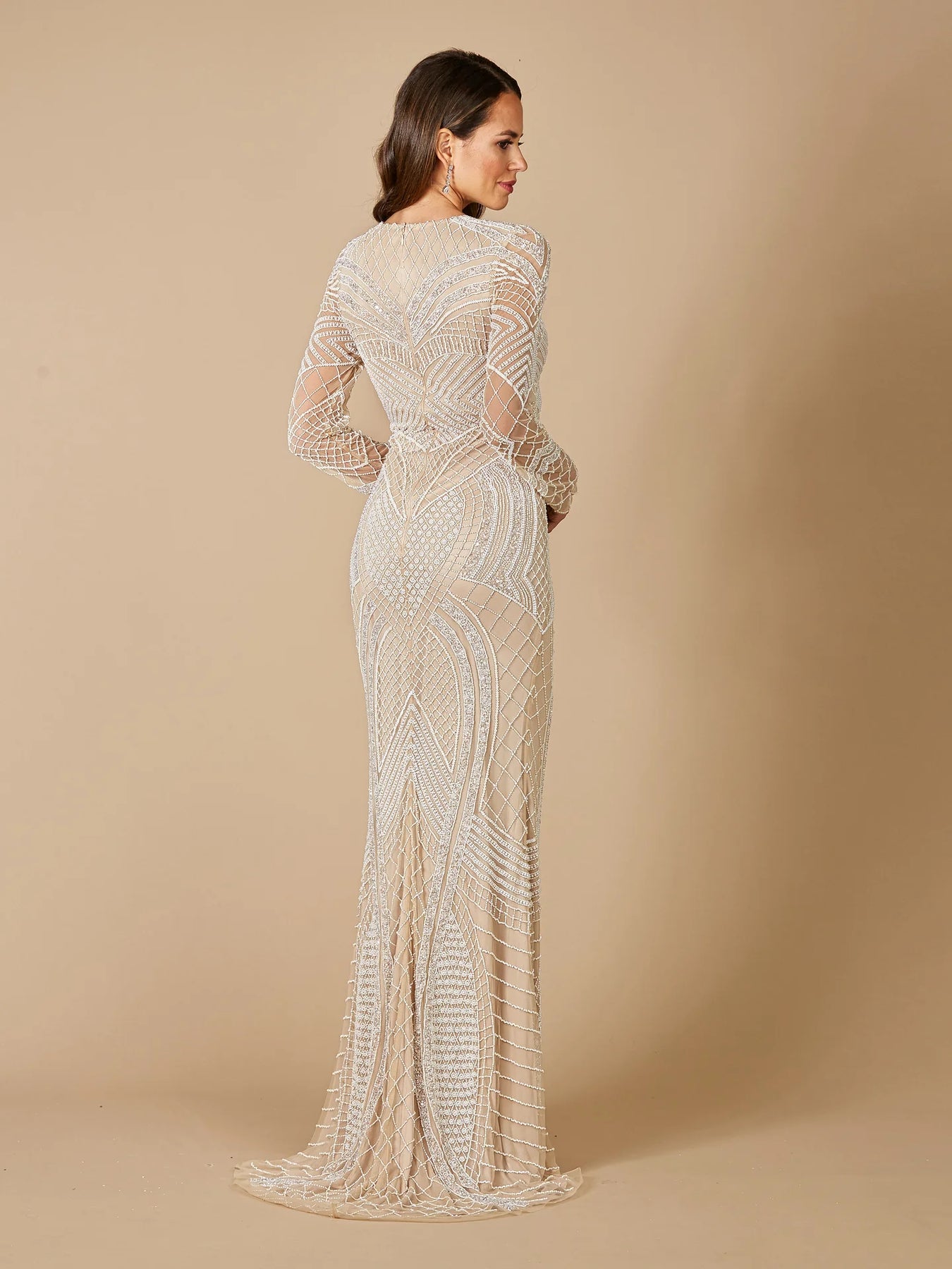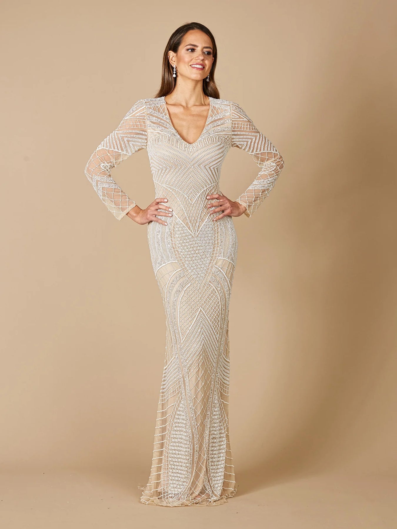 Beautiful ivory mesh fabric long dress embellished allover with stones, beads and sequins. It has a v neckline, sheer long sleeves with the bell bottom style. Our best selling modest Bridal gown for the last three years. The intricate details on this gown will make you feel stunning.